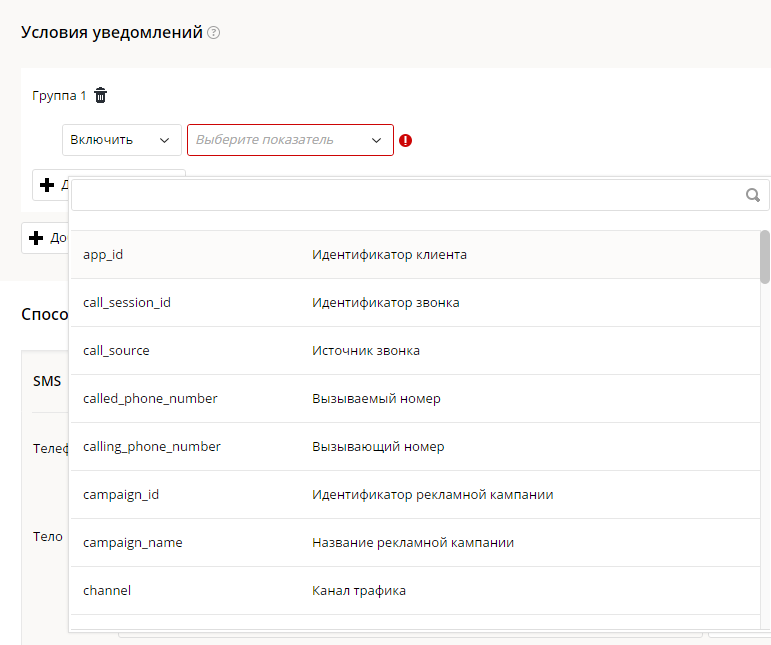 В поле "Если звонки" доступен фильтр по виртуальным номерам, сотрудникам, группам сотрудников, сайтам и рекламным кампаниям.
