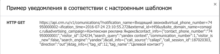 В разделе меню «Уведомления» пользователи могут настроить получение уведомлений о совершении определенных событий (входящий/потерянный звонок, голосовое сообщение, принятый факс и записанный разговор) по sms, email или посредством http-запроса - запрос (прием уведомления в CRM систему пользователя).