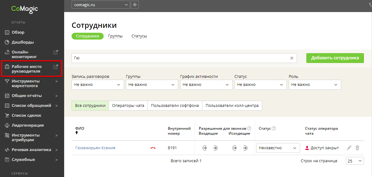 Чтобы подключить Рабочее место руководителя, нужно внести данные сотрудников вашего подразделения в Личный кабинет CoMagic и присвоить им роли Сотрудников и Руководителей. Впрочем, о подключении и настройке есть подробная статья.