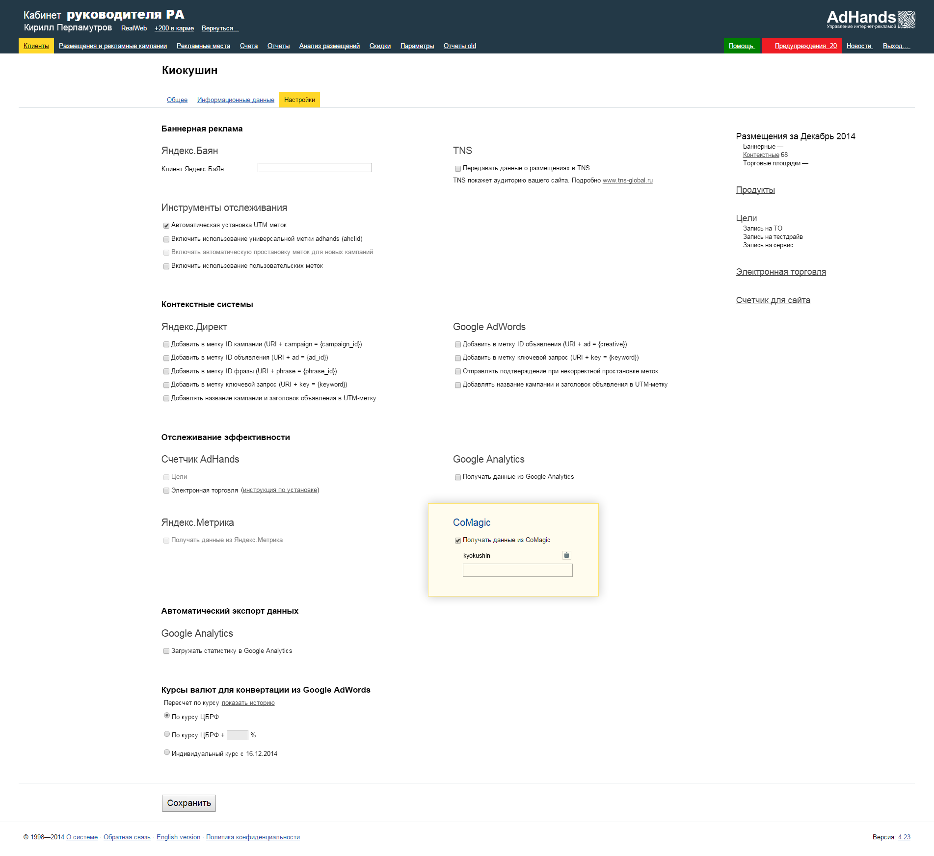 На вкладке «Настройки / Сайты / Интеграция с сервисами / Рекламные системы» появятся отметки о том, что сервис подключен, данные собираются: