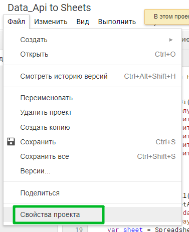 Откроется скрипт Data_Api to Sheets, перейдите в раздел «Файл → Свойства скрипта».