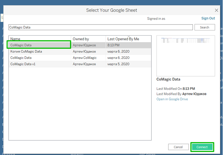 - Запустите Tableau Desktop и выберите в качестве источника данных Google Sheets.