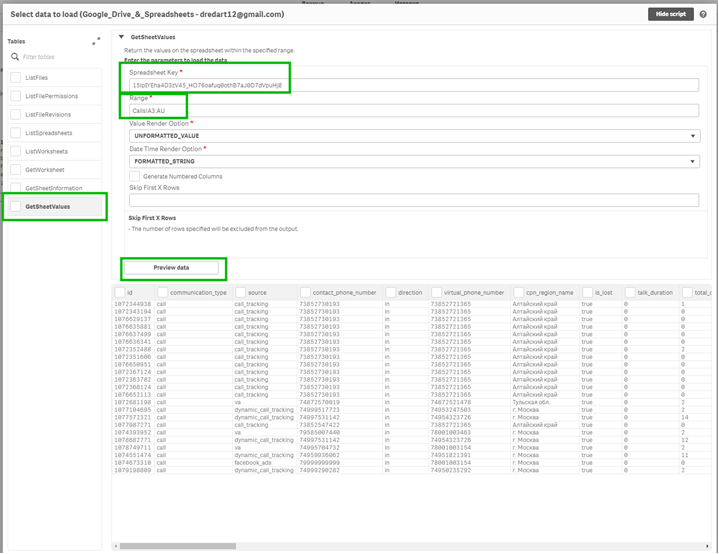 - Остальные поля заполните, как на скриншоте ниже, и нажмите Preview data. Если все ввели правильно, появятся данные: