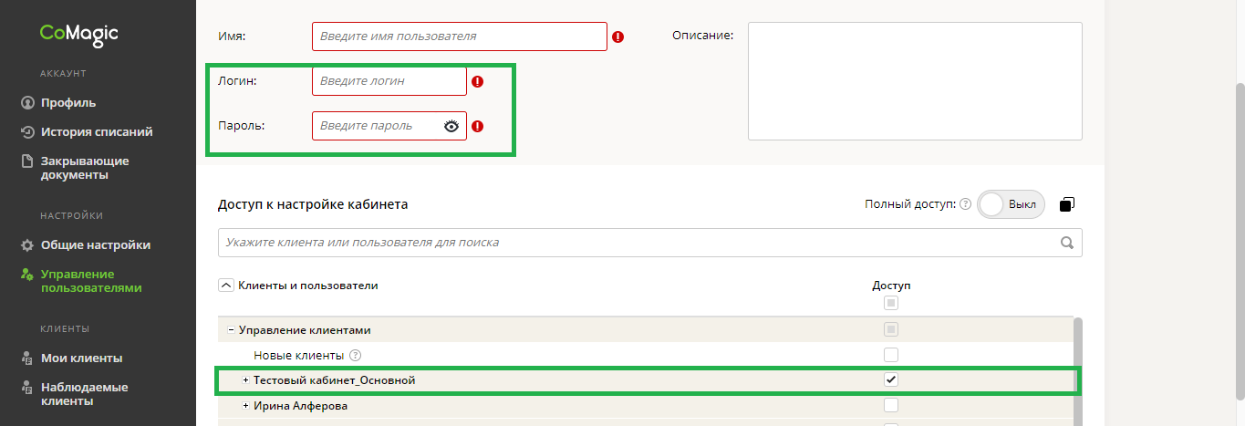 Если вы работаете по партнерской программе CoMagic, то у ваших клиентов может быть отдельный личный кабинет. Тогда настройка прав доступа будет происходит в зависимости от принадлежности кабинета клиенту или партнеру.
