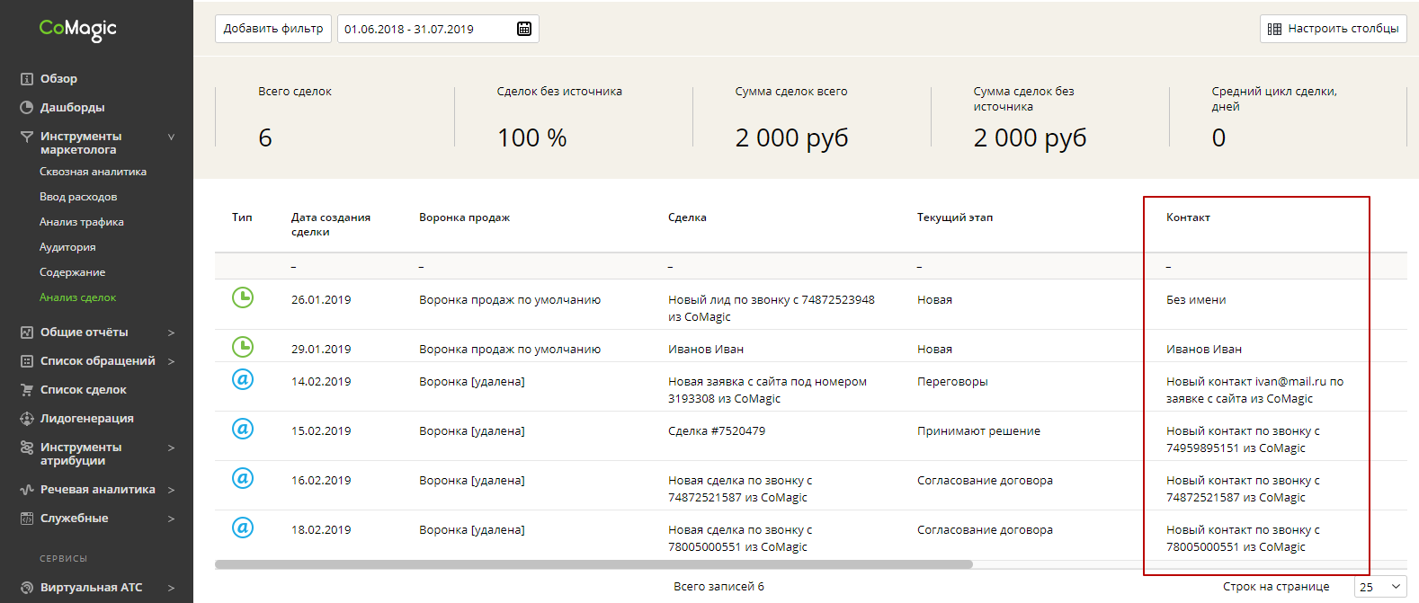 Анализ сделок — модуль, который позволяет проследить путь клиента от момента посещения сайта до момента оплаты. Отчет дает понимание, что происходит на каждом этапе воронки продаж и показывает, для какого процента сделок определены рекламные источники, насколько репрезентативны ваши данные. Модуль позволяет отслеживать нужные показатели в отчете Анализ сделок, а также в отчете Сквозная аналитика, в котором появились новые столбцы.