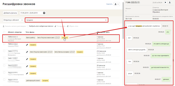 6. Чтобы найти определенную фразу в разговорах, введите ее в поиске. В строках звонков появятся разговоры с этими фразами. При клике на них разговор откроется в том месте, где данные фразы были использованы.