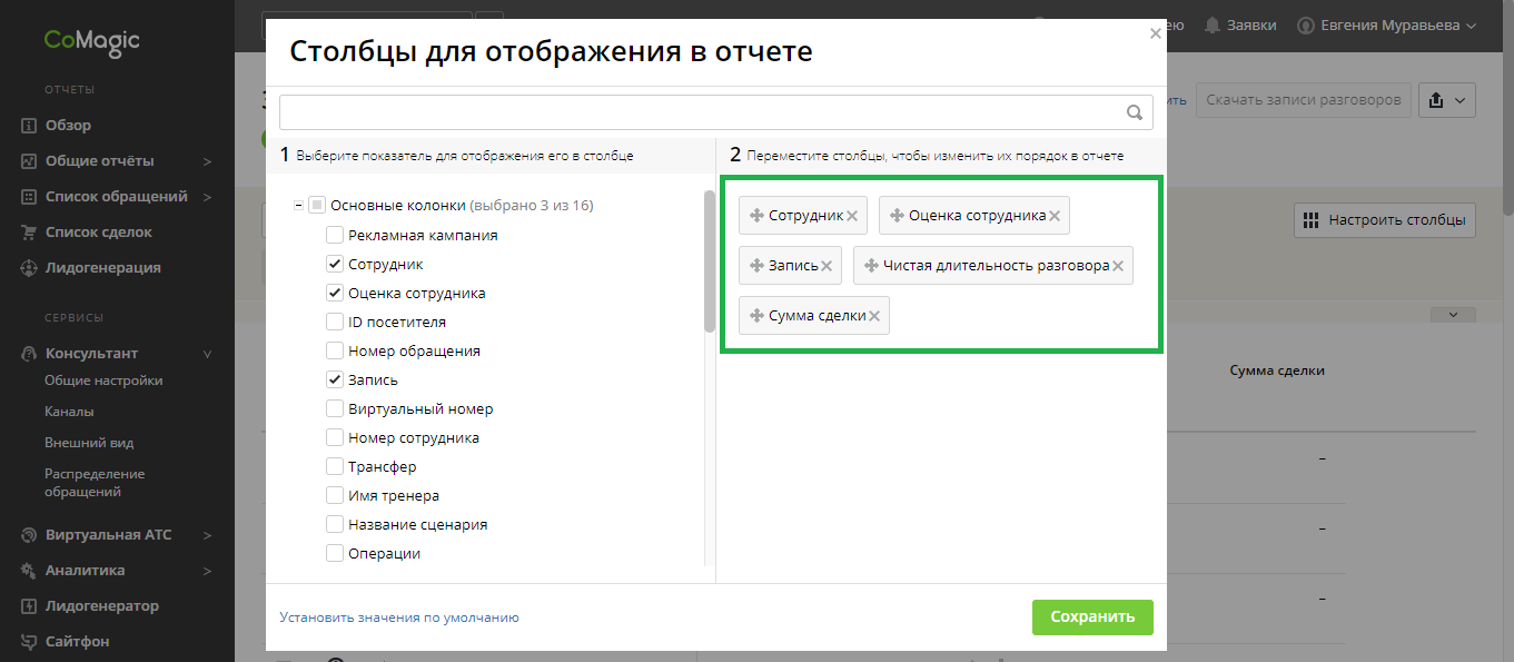 При клике на фамилию сотрудника происходит переход в отчет Речевая аналитика.