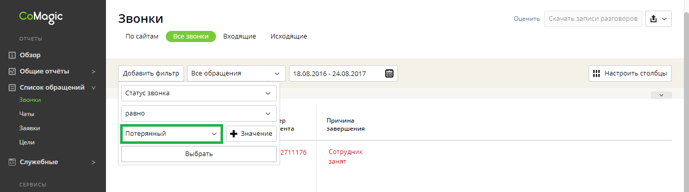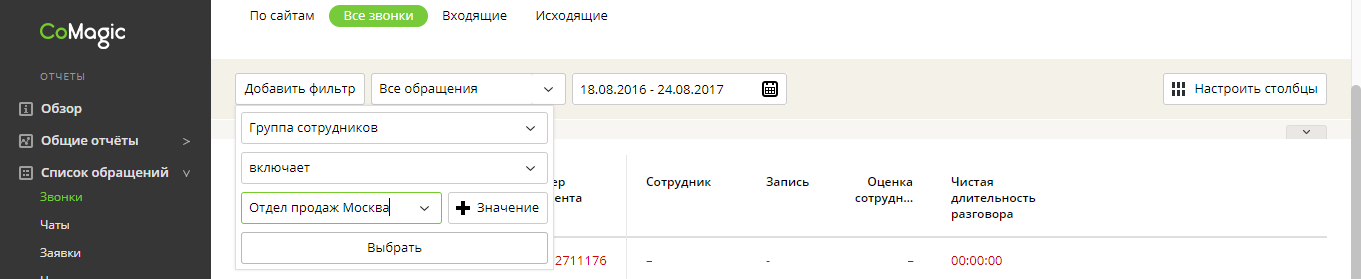 - другие параметры фильтрации. Соответствуют привычным параметрам фильтра отчета Список обращений/Звонки.