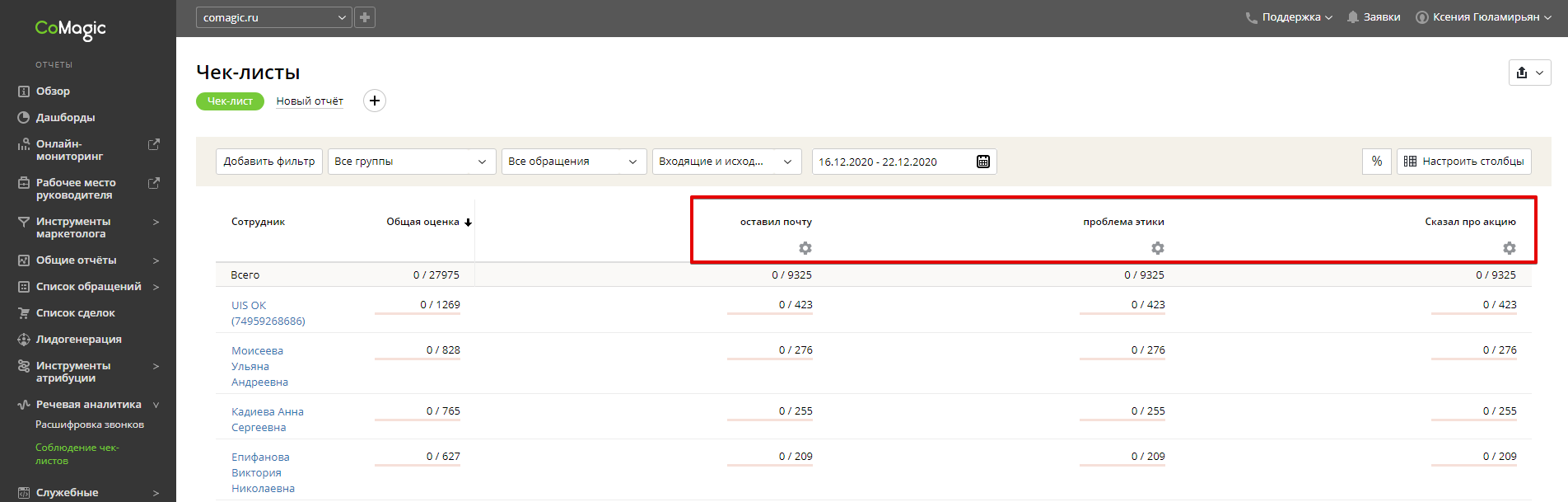 Строка «Всего» в столбце «Сотрудники» отражает отношение общего количества раз, когда должны были быть сказаны фразы из чек-листа, к количеству сказанных фраз по всем сотрудникам.