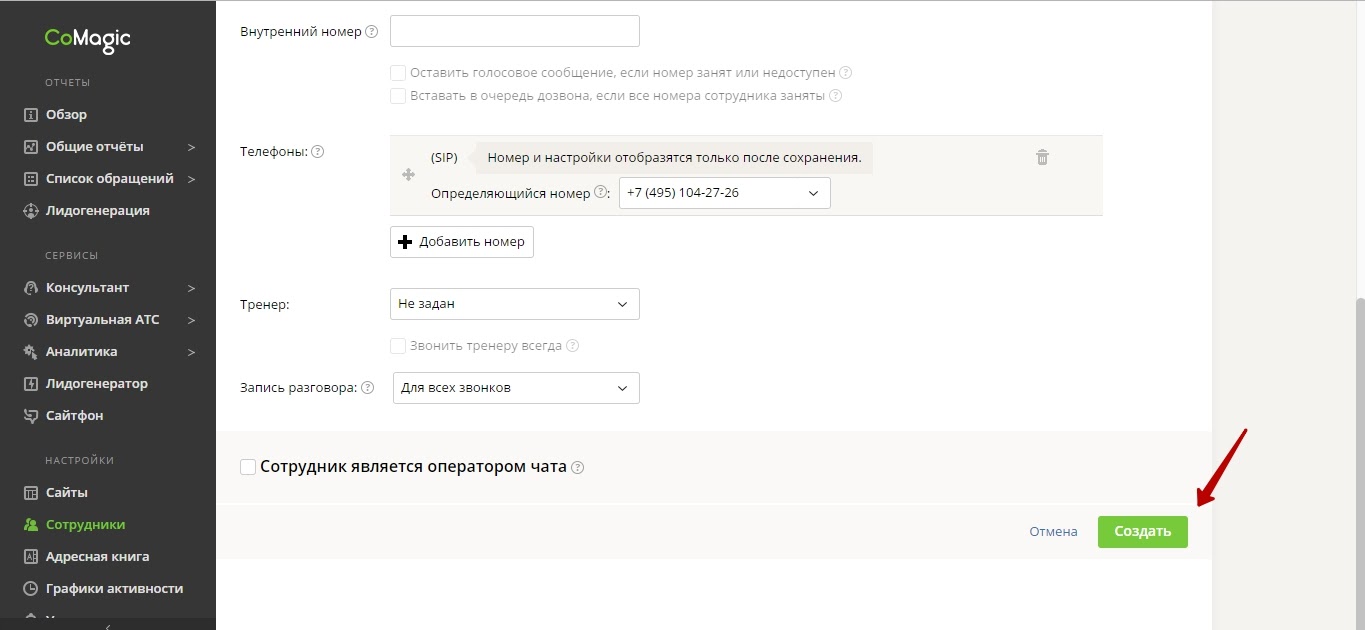 Дальше идем в конец страницы и сохраняем ее, нажимая создать или сохранить. Мы привязали sip-линию к сотруднику. Об этом же нам говорит цветная подсказка.