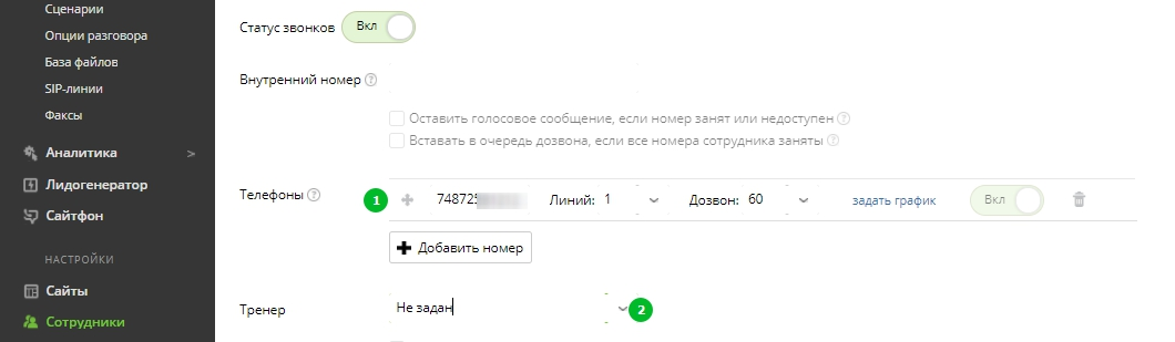 В Настройке сотрудника заполняем поля с именем и фамилией. Переключаем статус звонков в положение Включен. В поле Телефоны нажимаем кнопку Добавить номер – Sip-линия.