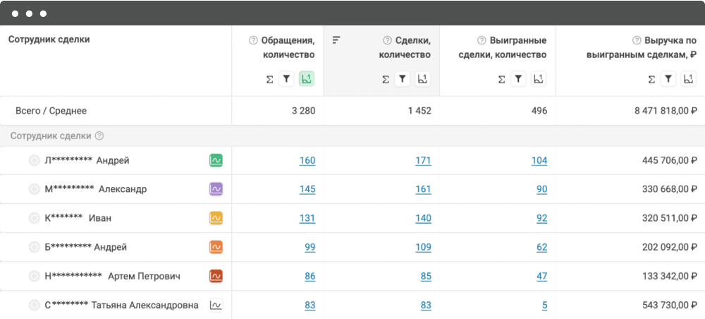 Анализируйте сделки на определенном этапе, продажи конкретных продуктов и звонки за выбранный период